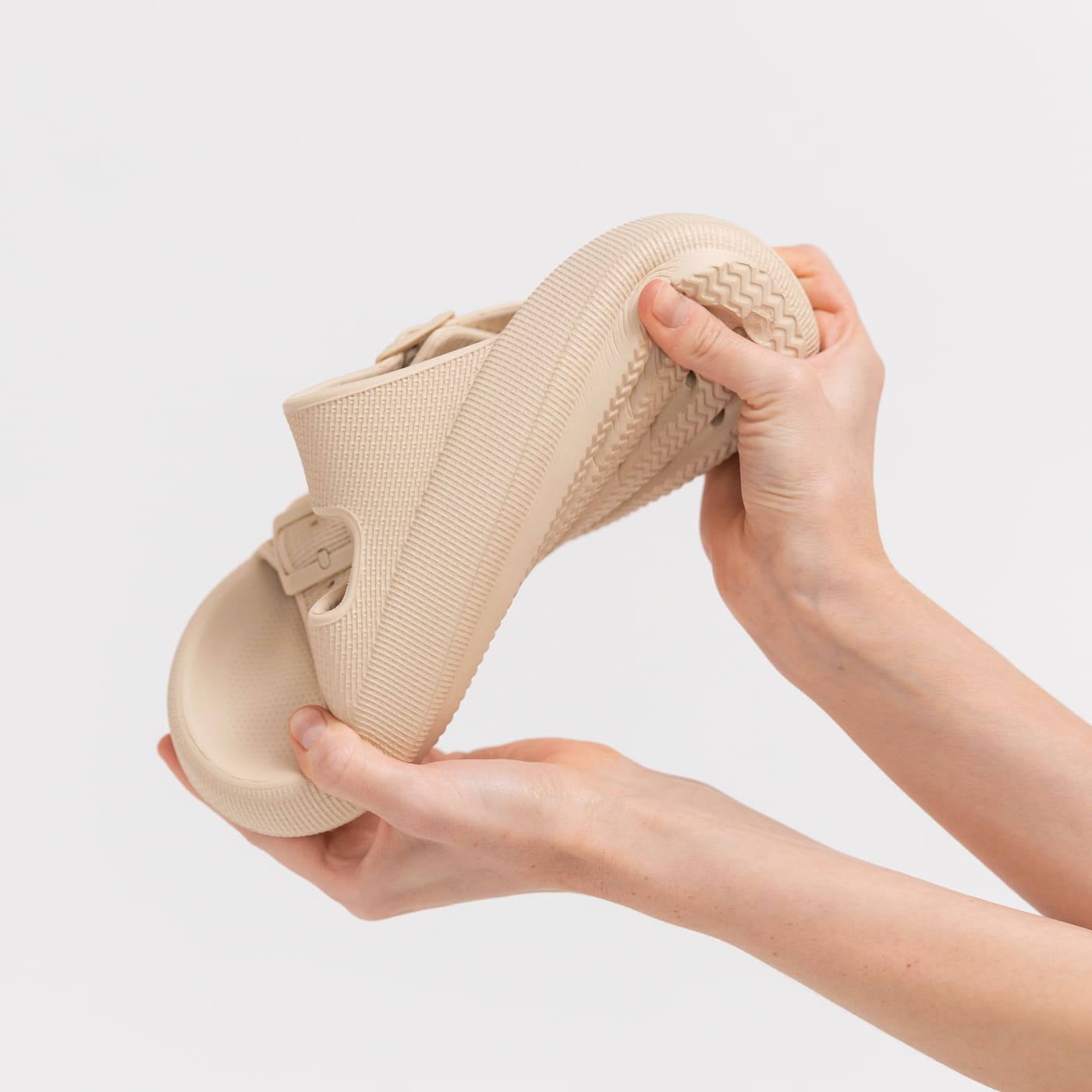 Durch das atmungsaktive und besonders flexible EVA-Material fühlen sich deine Famnis angenehm weich und ultraleicht an. Die softe Sohle federt jeden Schritt ab und entlastet deine Füße – perfekt für Zuhause, den Job oder entspannte Auszeiten.